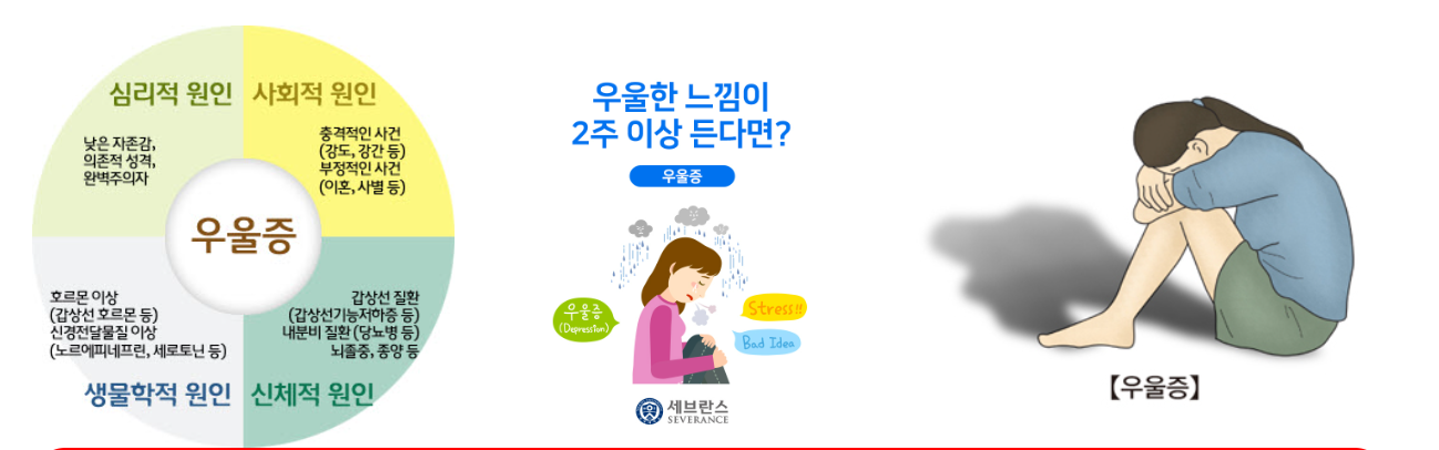 우울한 기분은 누구나 가끔 경험할 수 있지만, 정신의학에서 말하는 우울증은 단순한 기분 저하가 아닙니다. 우울증은 사고, 의욕, 관심, 행동, 수면, 동기 부여 등 전반적인 정신 기능이 저하된 상태를 의미하며, 이러한 증상들은 대부분 매일 지속됩니다. 우울증이 의심될 때 이를 단순히 지나가는 기분으로 여기고 방치하는 것은 좋지 않습니다. 우울증을 제대로 치료하기 위해서는 정신과 전문의의 전문적인 치료를 받는 것이 가장 바람직합니다.
